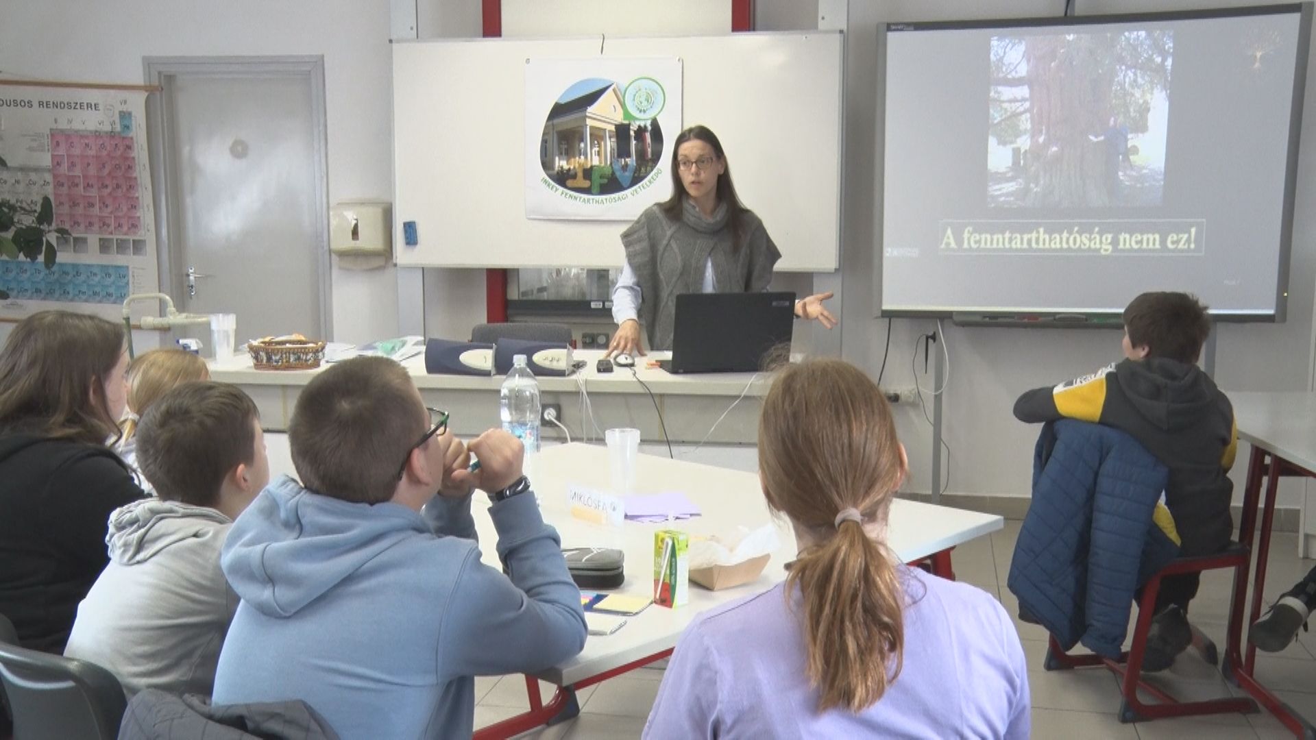A 10 Millió Fa Alapítvány Zala megyei képviselője, Simon Mónika előadásában olyan témákat is érintett a fenntarthatósággal kapcsolatban, amelyeket hazánkban még nem is alkalmaznak. – A fenntartható fejlődésről fogunk beszélni, arról, hogy mi is az a fenntarthatóság, egy picit fogok beszélni a körforgásos gazdálkodásról, ennyi időben nem tudok mindenbe belemenni. Szeretném bemutatni nekik a cselekvés anatómiáját, ami még Magyarországon nem ismert, de az ENSZ fejlesztette ki egy ans Cool nevű iskolával, ami Ausztráliába van–fogalmazott Simon Mónika, a Green Gains Civil Szervezet elnöke.